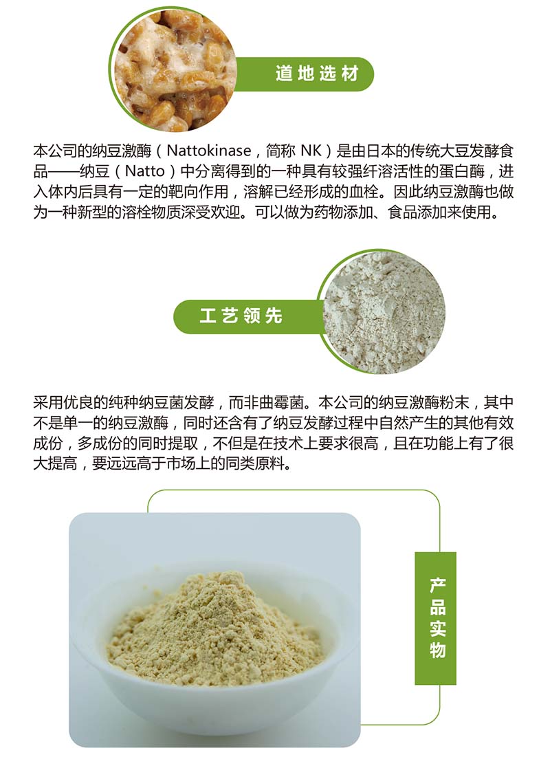 納豆激酶(Nattokinase,簡稱NK)則是由日本的傳統(tǒng)大豆發(fā)酵食品——納豆(Natto)中分離得到的一種具有較強纖溶活性的蛋白酶,進(jìn)入體內(nèi)后具有一定的靶向作用,溶解已經(jīng)形成的血栓。因此納豆激酶也做為一種新型的溶栓物質(zhì)深受歡迎??梢宰鰹樗幬锾砑?、食品添加來使用。這也是須見洋行教授首次發(fā)現(xiàn)的。
