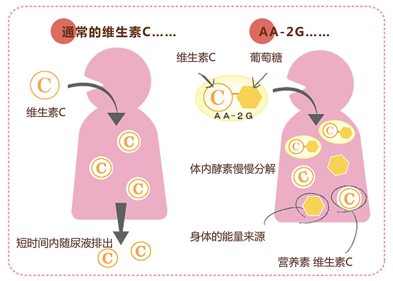 也就是說,AA-2G在體內(nèi)可以慢慢分解,體內(nèi)長時間持續(xù)性地保留維生素C的存在并發(fā)揮作用。